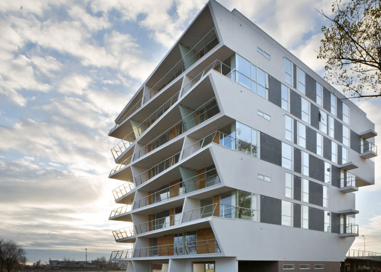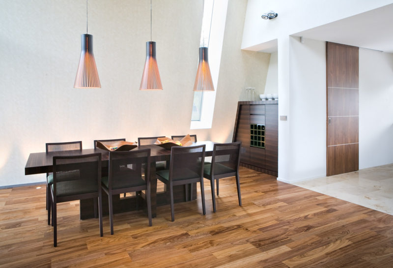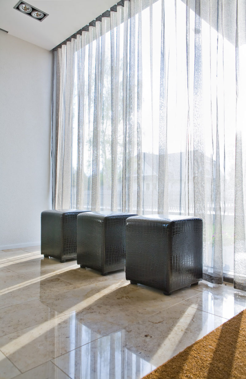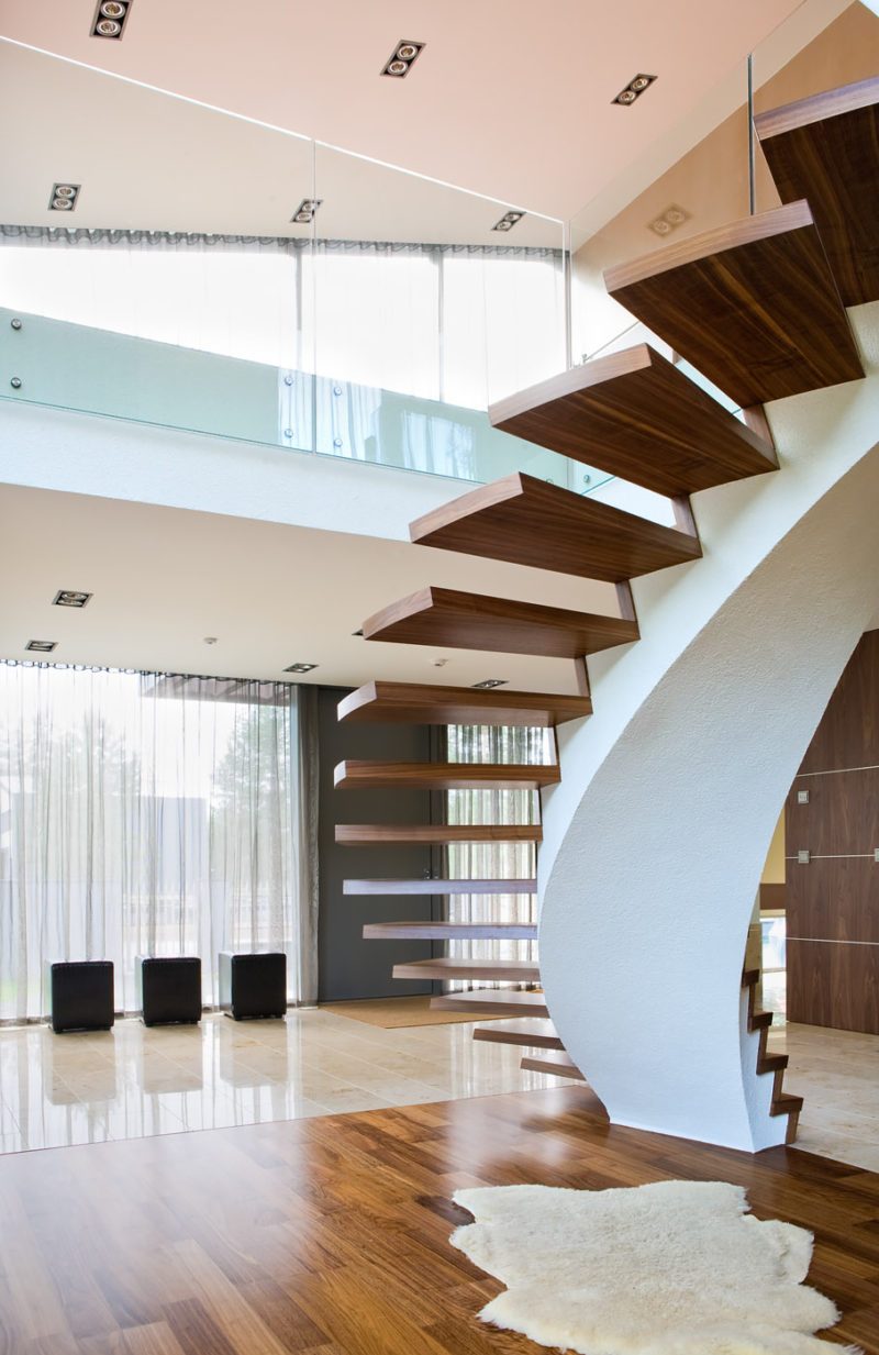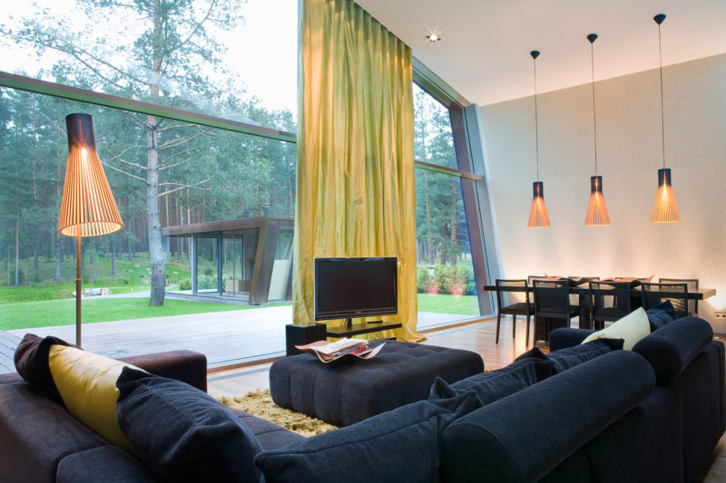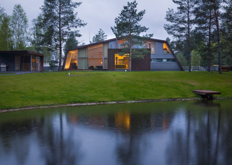The layout is a pretty simple T-shape, but what makes this home by Karmo Tõra stand out is the pentagon-shaped intersection and facade, and the way indoor and outdoor spaces blend together using glass walls in the living room, and the small gym nonetheless. Feels like you’re working out under those pine trees.